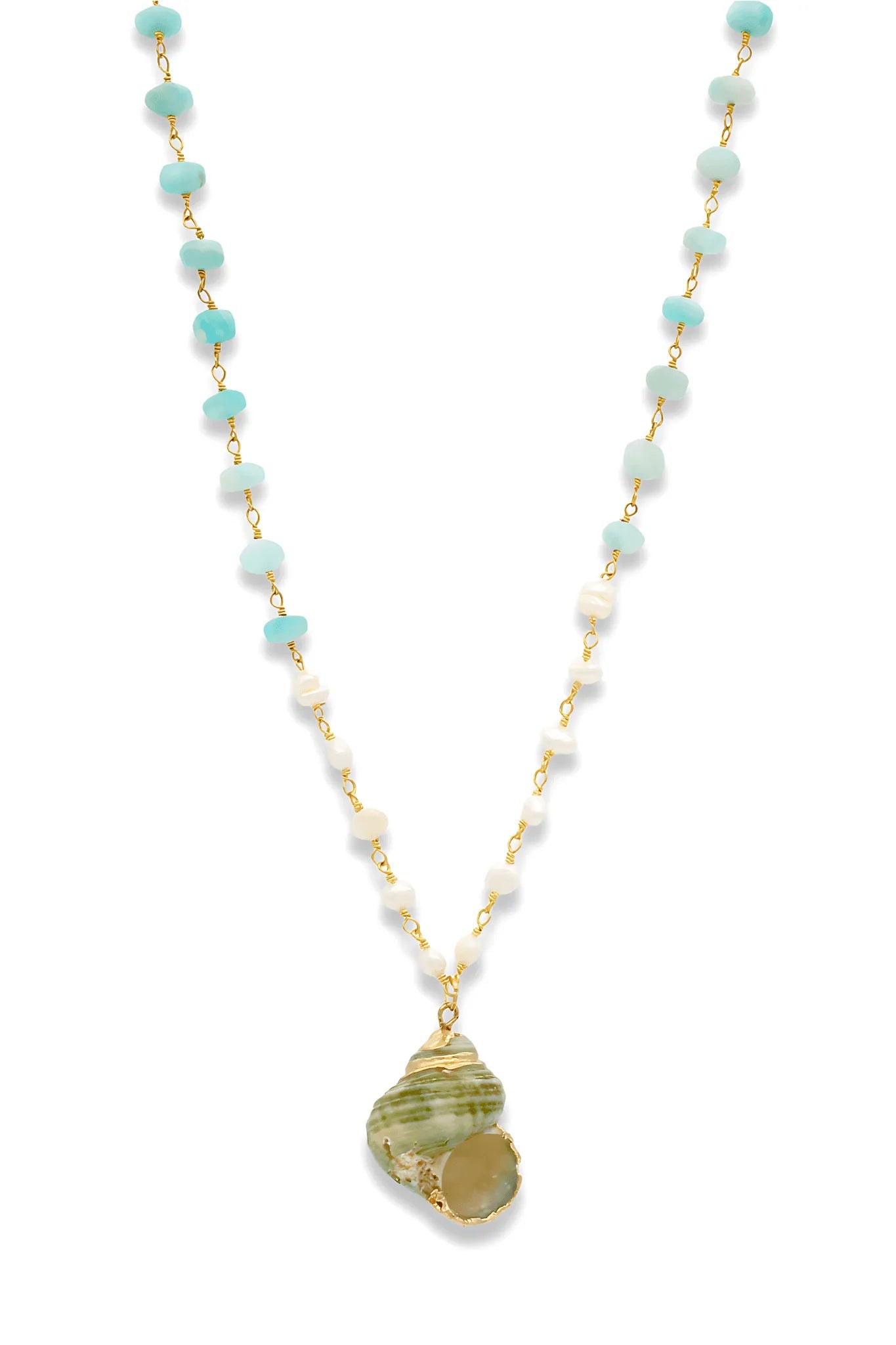 Amazonite and Pearl Shell Necklace set on Vermeil (Micron Gold plated Silver) with approx. 6mm rough Amazonite gemstone beads and fresh water Pearls with a 15/20mm shell pendant with Gold leaf trim.