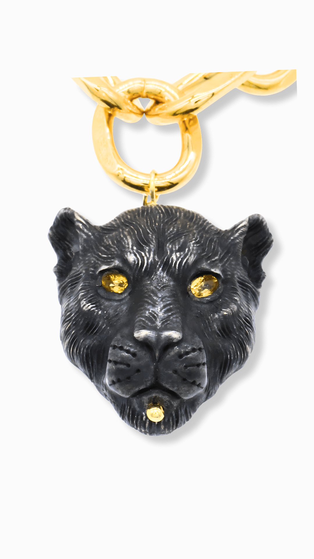 A heavy, high-luxury gold-plated aluminum chain forms the base—lightweight yet substantial—supporting a sleek blackened silver panther pendant. With yellow sapphire eyes and a gold-plated silver bail set with green tourmaline, this piece balances strength and sensuality. Perfect for layering or as a solo statement.