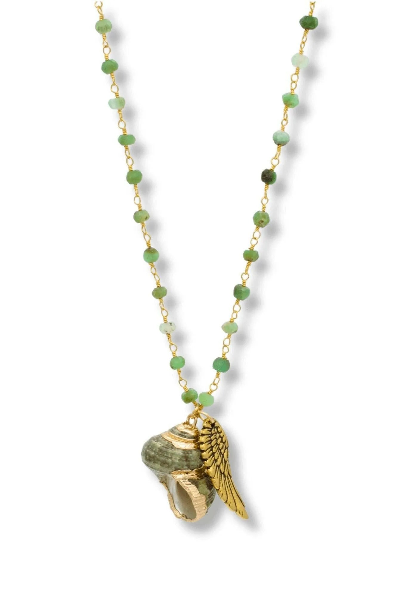 Chrysoprase Vermeil chain with green shell pendant trimmed with Gold and Angel wing pendant. 75cm in length.