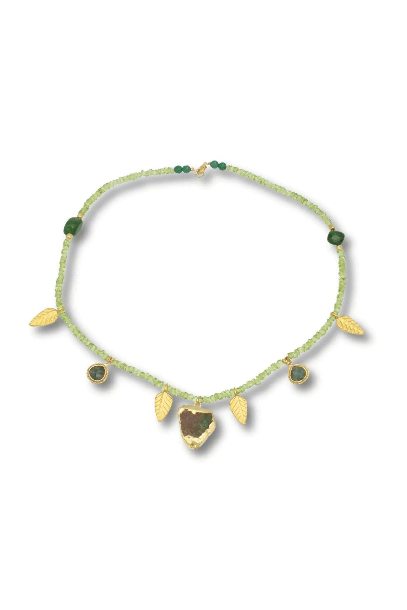 Short Peridot necklace with Gold Micron plated Silver leaves and the following Semiprecious stones.
