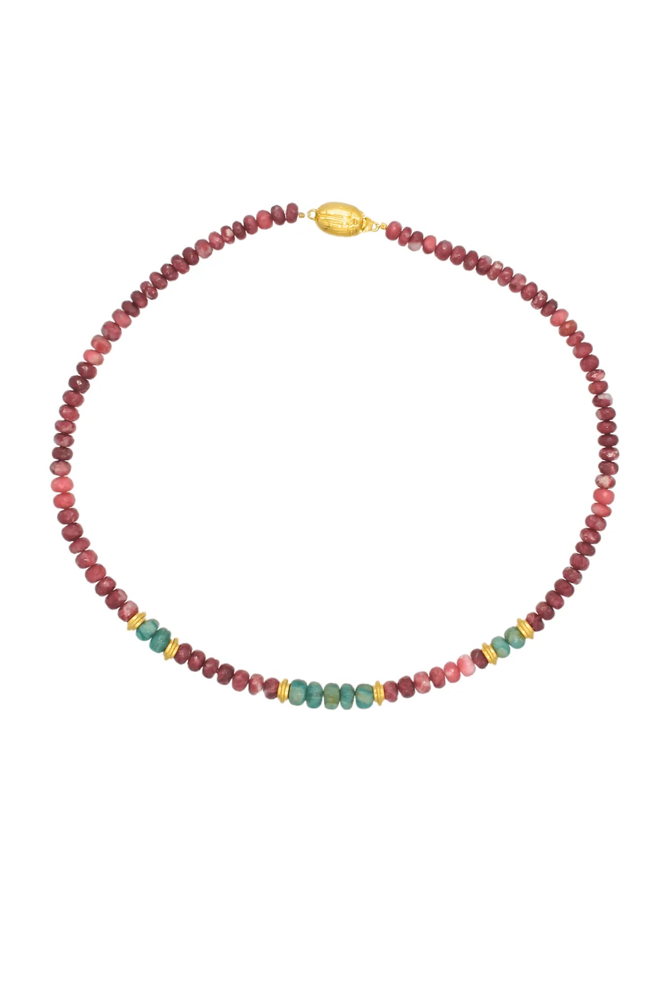 This gorgeous collar necklace is made using calibrated and faceted 5/7mm Thulite and Chrysoprase with a Vermeil scarab clasp.