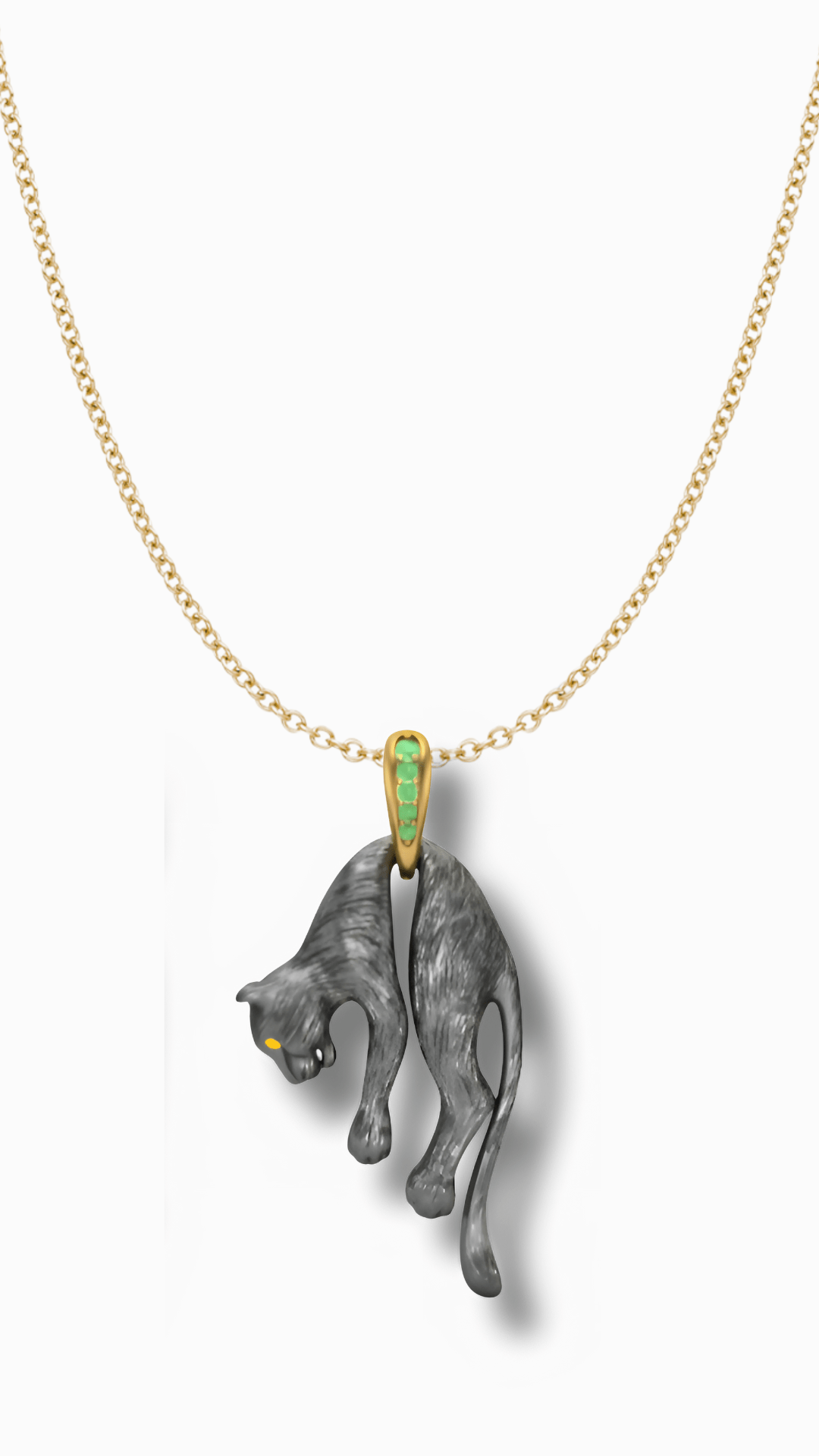 Sculpted from blackened sterling silver, the panther's form is both fluid and fierce, featuring glowing yellow sapphire eyes for an intense gaze. The bail is gold-plated silver, accented with vibrant green tourmaline stones, creating a luxe contrast of texture and tone. Hung on a fine gold-tone chain, this pendant channels both power and grace.