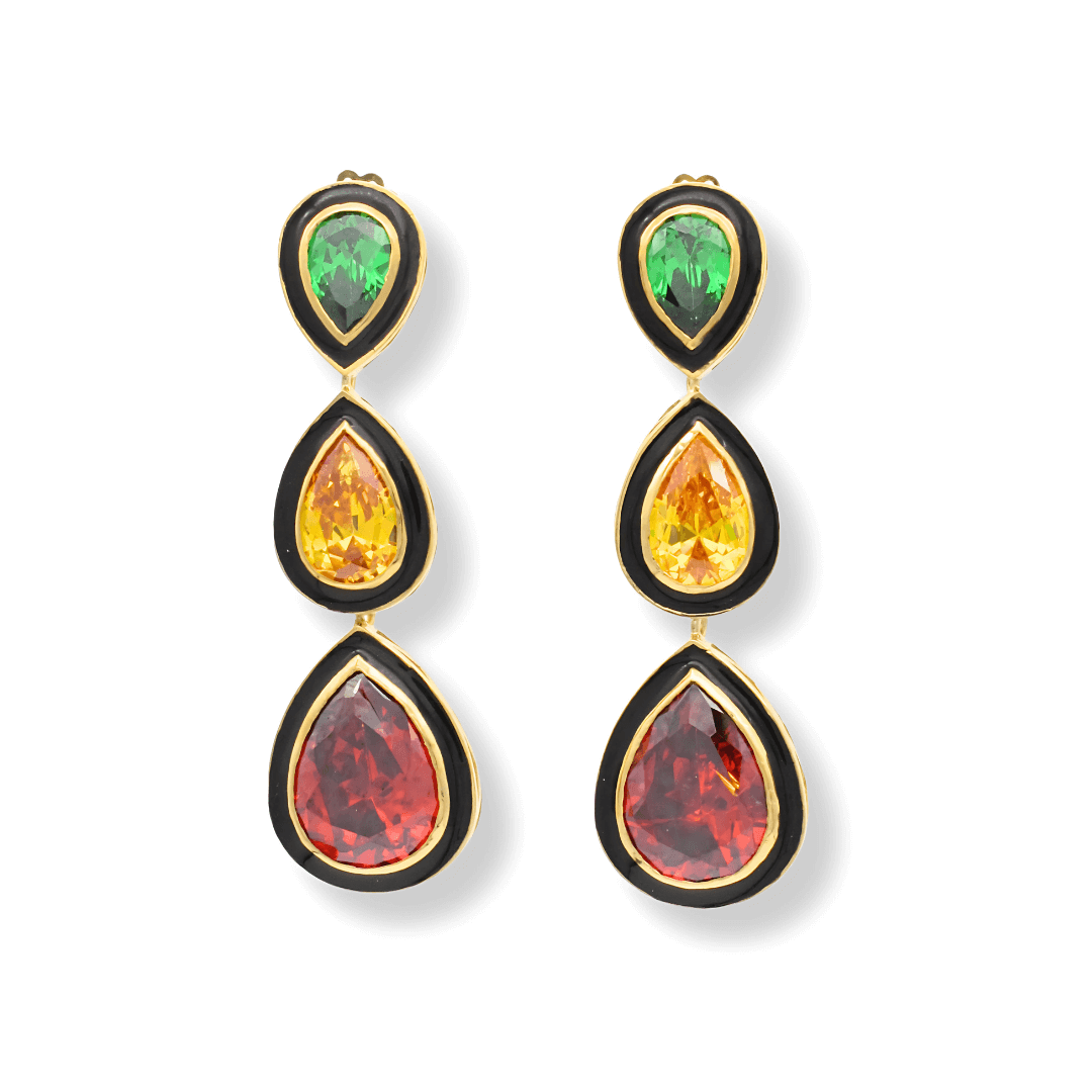 Swarovski crystal earrings with black enamel measure 4,3cm in length and are made with beautiful bright green, red and yellow faceted and sparkly Swarovski calibrated pear drop crystals.
