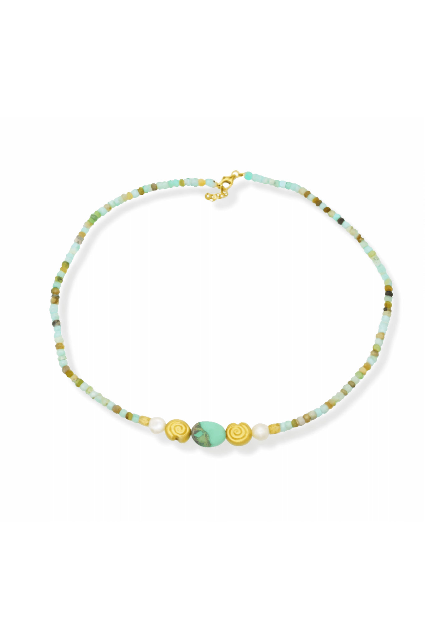 Amazonite Pearl Collar A refined short collar crafted in Italy, featuring a 7mm masonite nugget centerpiece flanked by 4mm peas and a graceful row of 4mm Amazonite beads. The understated design transitions effortlessly from solo wear to layering with pieces from our Amazon and Atlantis collections, making it an essential building block for curated necklace combinations.