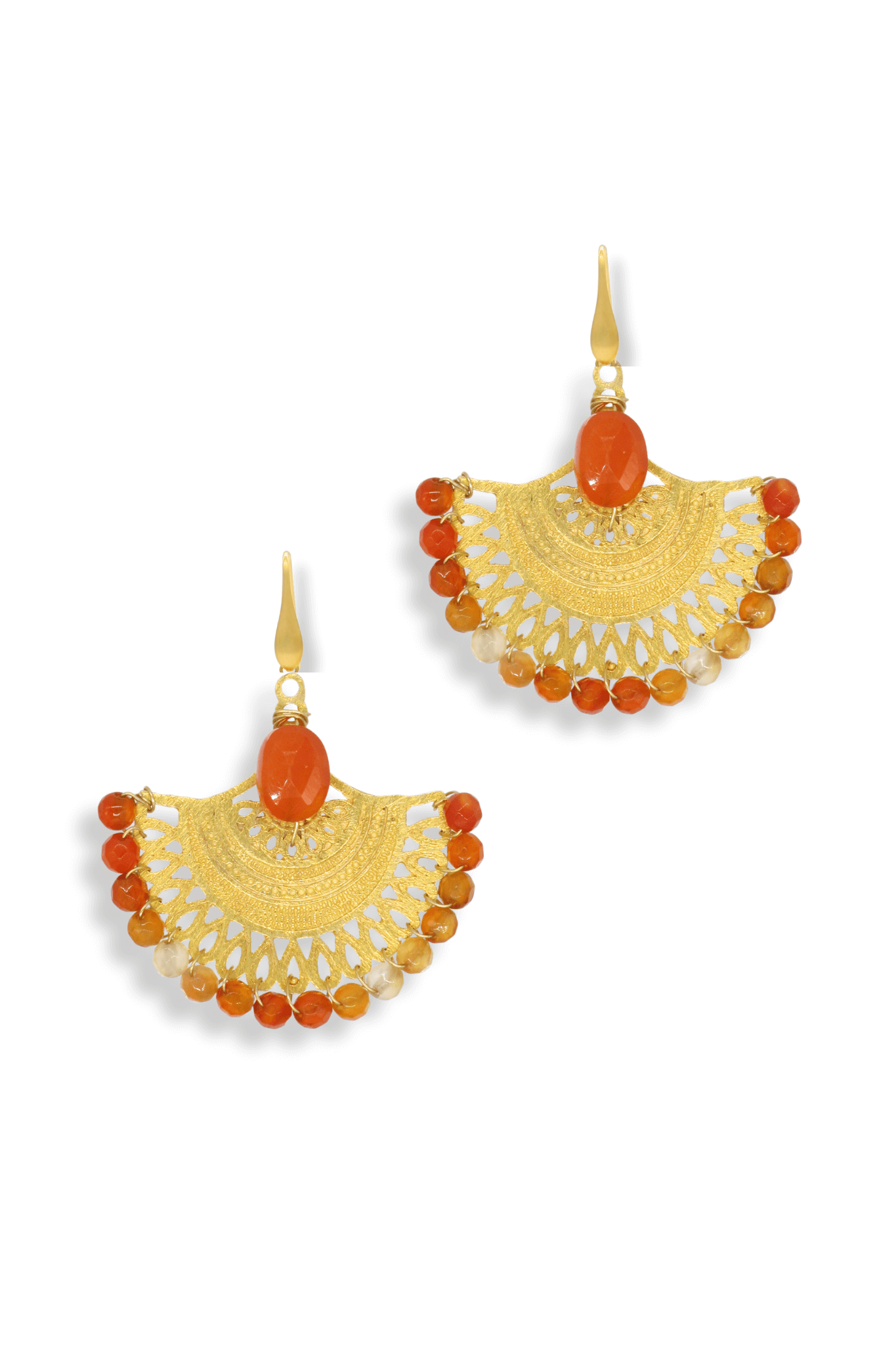 At the center, a rich fire opal draws the eye, complemented by a stunning fringe of deep orange carnelian and warm-toned natural stones. Lightweight yet striking, these earrings are perfect for sunlit escapes, resort evenings, or standout daywear.