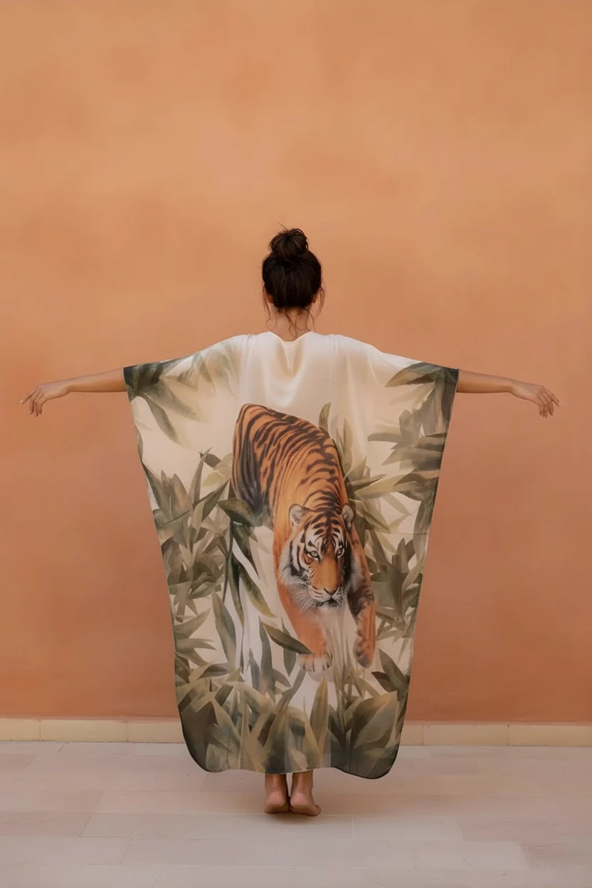 This flowing piece features tiger stepping through soft botanical tones — a symbol of courage, intuition, and calm strength. Each kimono is printed and artisan-finished in Lake Como, Italy, where the world’s finest textile houses have crafted luxury fabrics for generations.